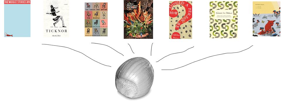 Click on one of the books to read more about it. From left to right, the story collection The Middle Stories (McSweeney's, 2001); the novel Ticknor (Farrar, Straus & Giroux, 2005); a book of "conversational philosophy" written with Misha Glouberman titled The Chairs are Where the People Go (Faber, 2010); the play All Our Happy Days are Stupid (McSweeney's, 2015); the novel How Should a Person Be? (Henry Holt, 2012); Women in Clothes edited by Sheila Heti, Heidi Julavits and Leanne Shapton with 639 other voices (Penguin, 2014); the children's book We Need a Horse with illustrations by Clare Rojas (McSweeney's, 2010). |